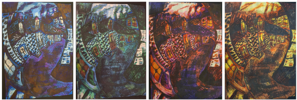 I chose to create a scene in the Industrial Revolution. To get this effect, I created a charcoal piece, then in Illustrator used the 'Image Trace' function to get bold shapes and lines. I could then print this out and color it with alcohol markers.
